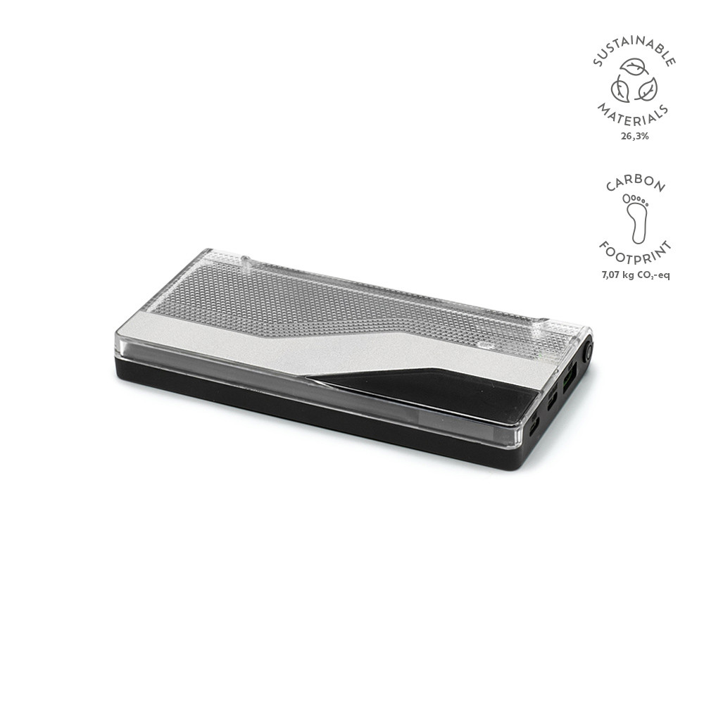 Batterie portable Voltix au design futuriste et élégant, en ABS recyclé. Équipée de 2 ports USB-A et 1 port USB-C, elle permet une charge rapide (jusqu’à 18W) et peut recharger un smartphone 4 à 5 fois avec une seule charge. Écran LCD intégré pour suivre le niveau d’énergie. Livrée dans une boîte kraft individuelle "seconde vie". Entrez dans le monde de la commodité.