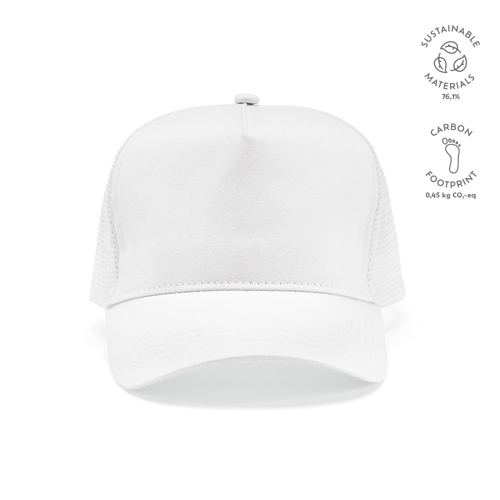 La casquette Zappa : panneau avant en coton recyclé 220 g/m², 4 pans en mesh rPET, fermeture snap réglable en rPET, 5 pans, livrée dans un sachet biodégradable.